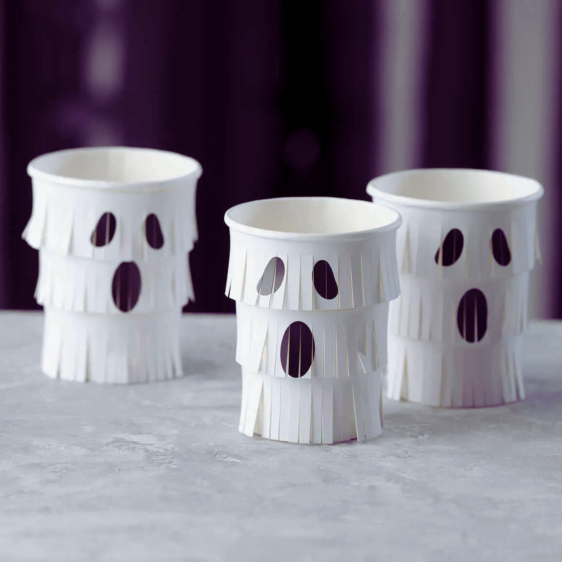Serve your seasonal drinks in these spooky and stylish ghost cups! Perfect for Halloween parties and guests of all ages. These white paper cups feature fun outer fringing. Pack includes 8 ghost cups, capacity 266ml. Brand: Ginger Ray.